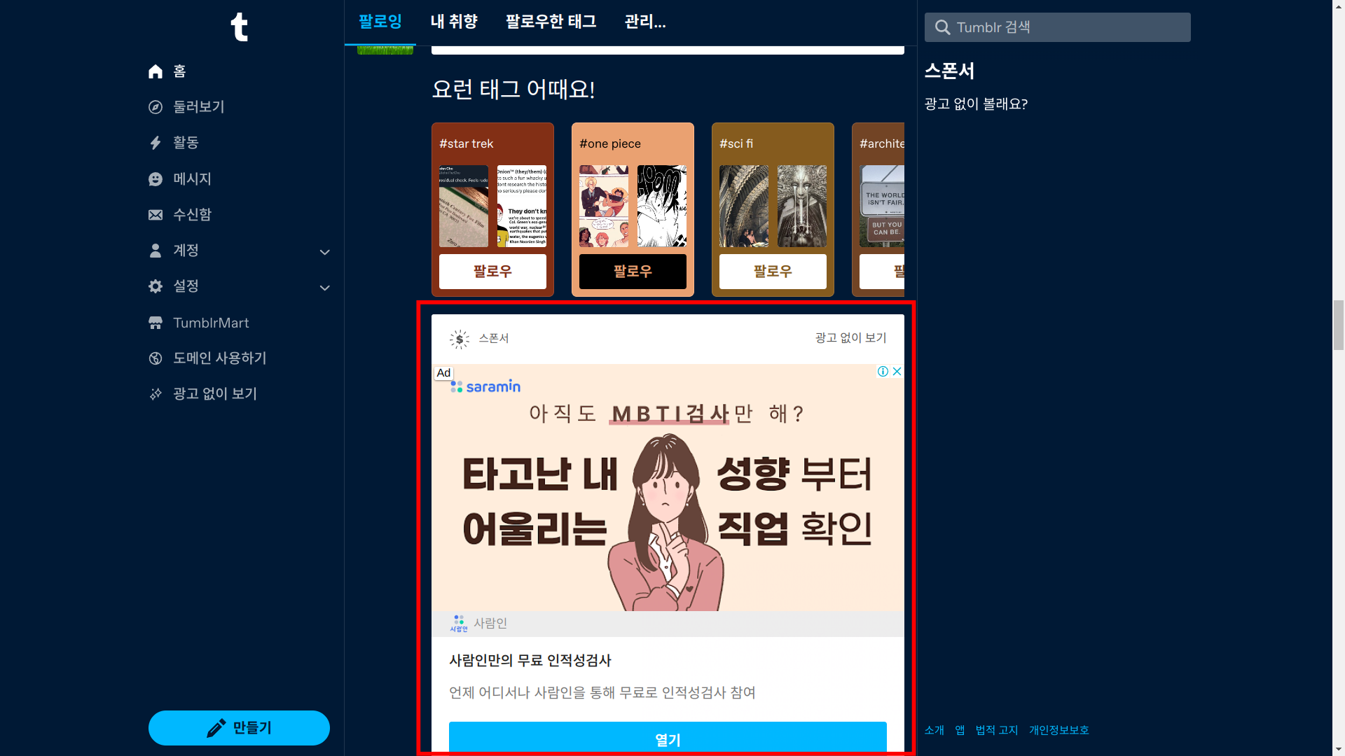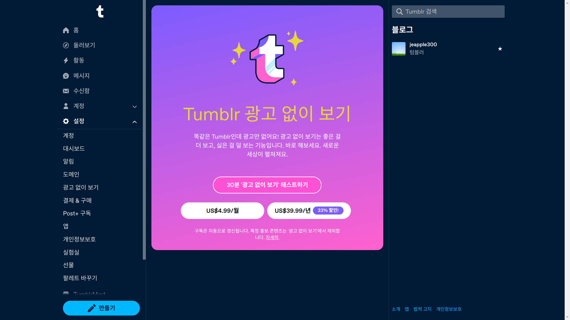그리고 애드센스 등 광고를 관리 및 피드에도 넣는다. 아래 그림을 해외 블로그인 텀블러(Tumblr)로 접속하면 나오는 관리로 거기에도 광고가 나온다. 그 광고를 보고 싶지 않다면 돈을 내라는 안내가 나온다. 참고로 스폰서라는 것이 광고이고 4.99 달러는 약 6천 원이다.