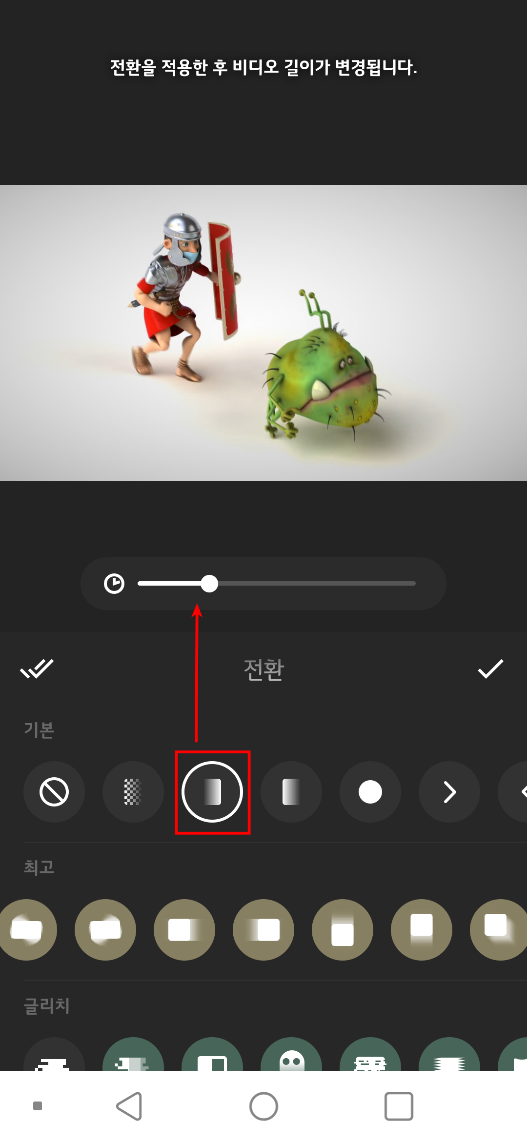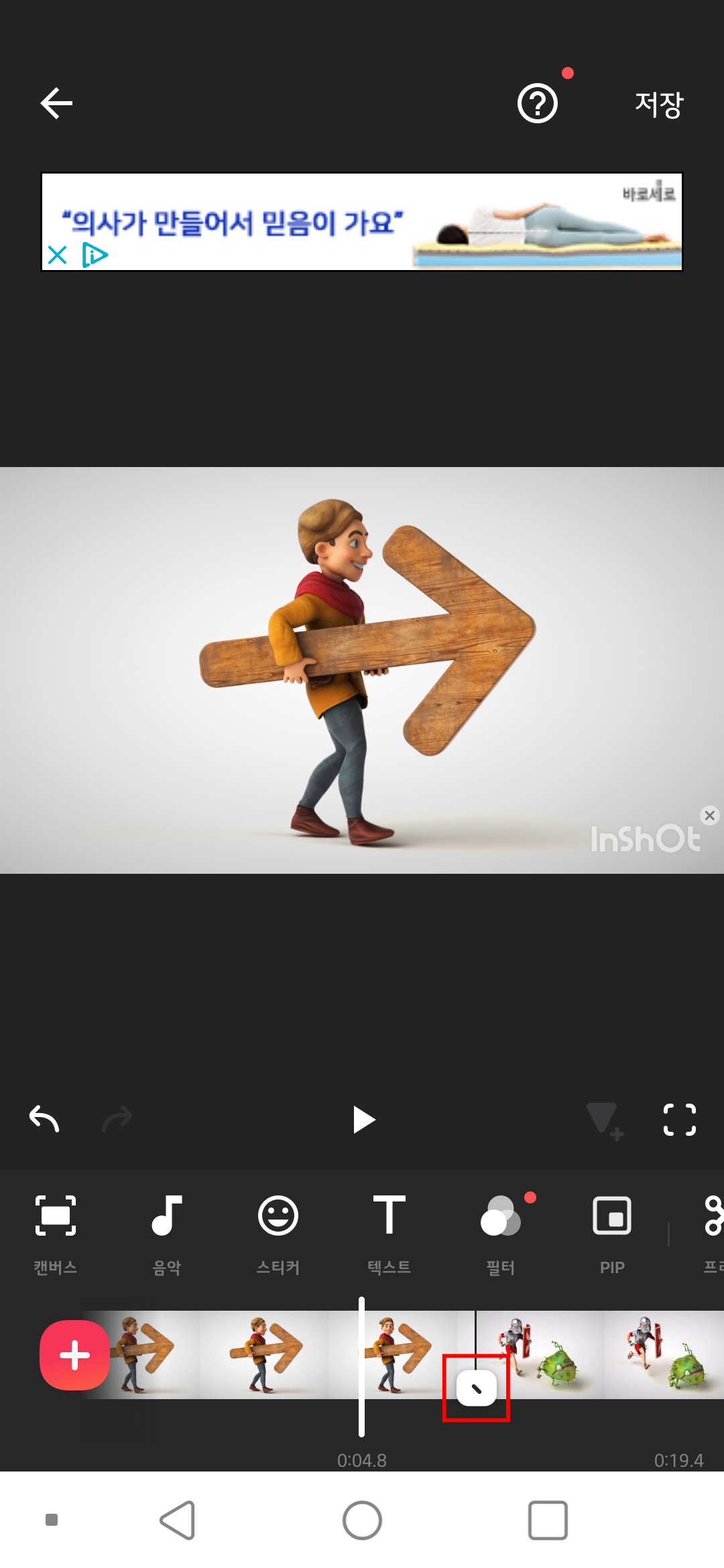 그리고 아래 애니메이션은 InShot에서 만든 동영상을 애니메이션으로 변환했다. 삽입한 비디오 간 전환도 지원한다. 동영상과 동영상 만나는 지점의 사각형 아이콘을 클릭하면 전환을 위한 영상을 설정할 수 있다. 전환 영상은 기본을 비롯하여 상당히 많다. 그런데 Inshot내의 모든 전환효과를 사용할 수 없다. 예로 기본 아래 나오는 최고라는 전환은 유료 사용자(PRO 사용자)만 사용할 수 있다.