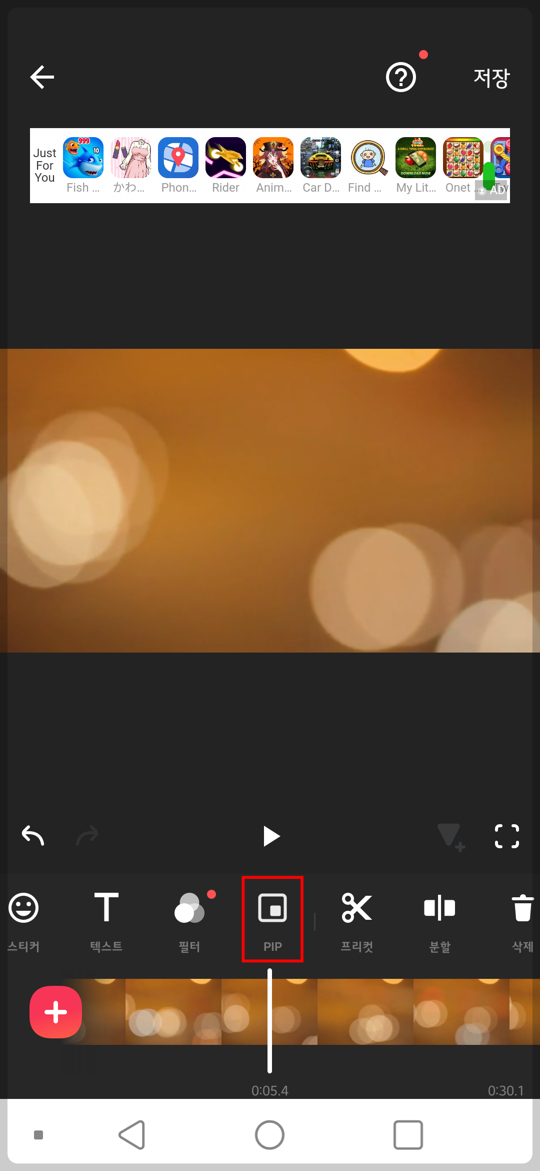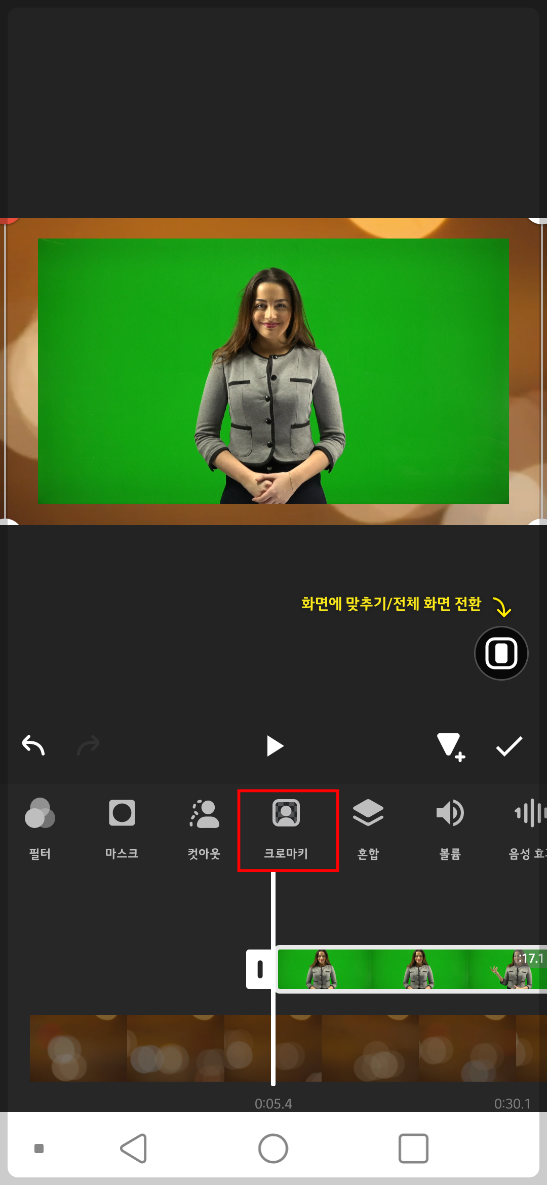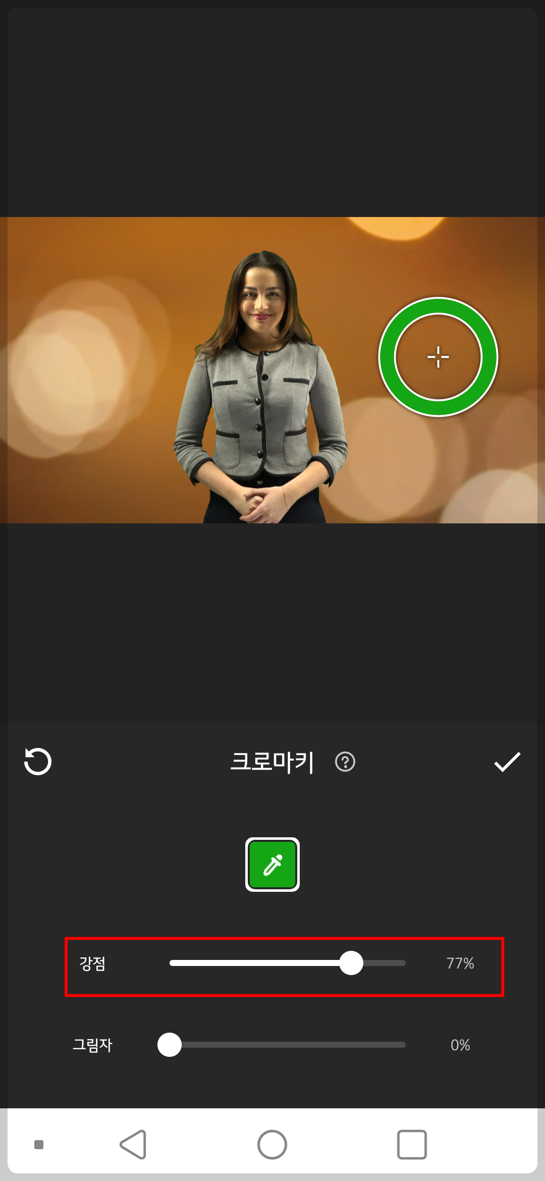 그렇다고 그 앱이 많이 부족하다는 것은 아니다. PIP를 사용하여 동영상을 불러온 후 크로마키를 사용하면 영상에서 배경색을 투명으로 할 수 있다는 것을 알 것이다. 아래 세 번째 그림을 보면 초록색을 투명으로 할 수 있다. 배경색 투명이 어색하면 강점을 조절하면 된다. 나는 강점을 77%로 했다.
