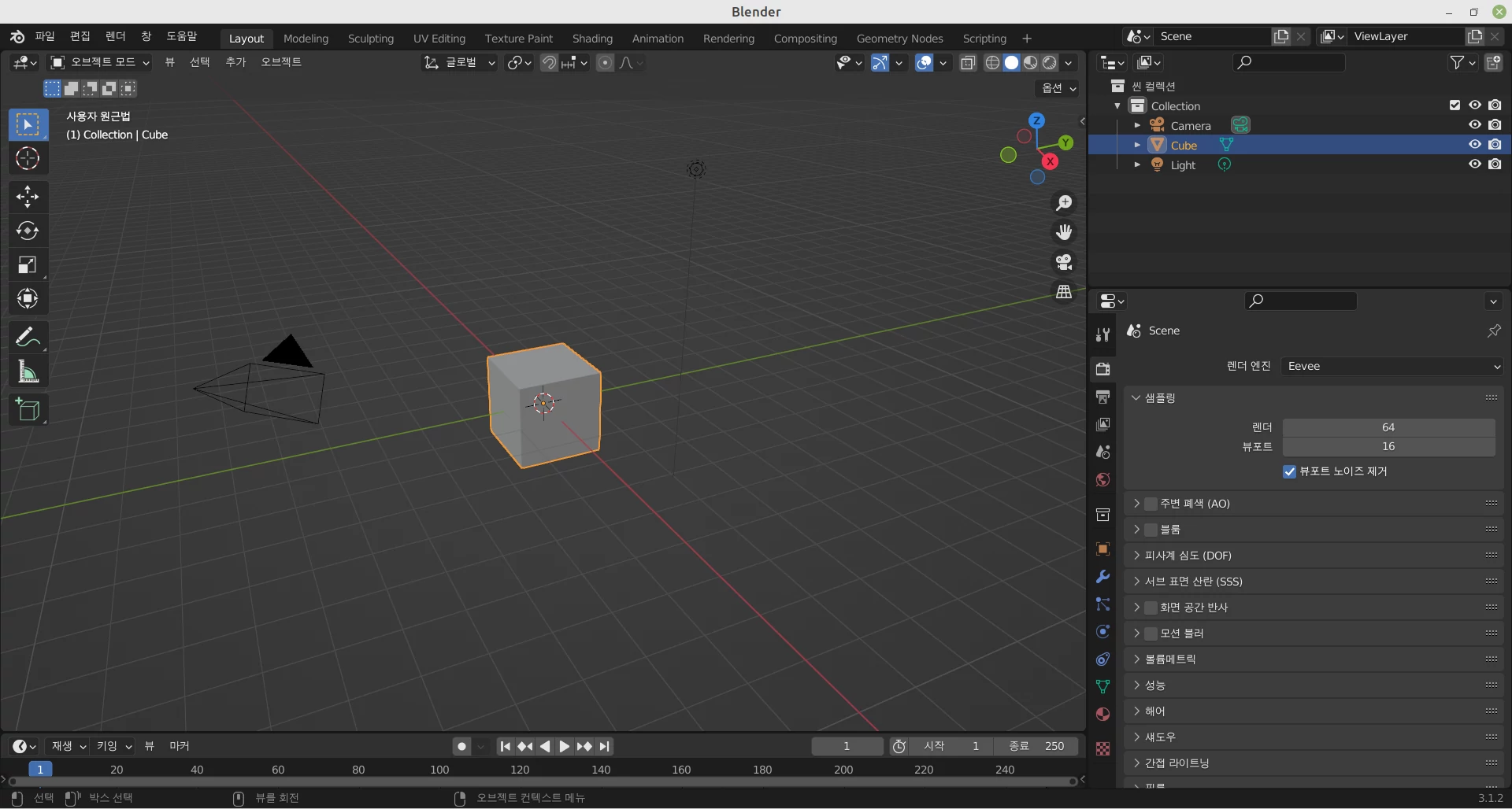 리눅스에서 널리 알려진 3D 모델링,애니메이션 프로그램으로 블렌더라는 것이 있다. 아래 보이는 인터페이스는 영어지만 한글로 설정할 수 있다. 다만, 유튜브 등 설명이 한글보다 영어 설명이 많아 영어로 설정하는 것이 편하다. 참고로 아래 그림은 버전이 3.1.2인데 버전이 낮다면 한글이 깨질 수 있다. 내가 버전 2.8.2a를 설치했는데 한글이 깨졌다.
