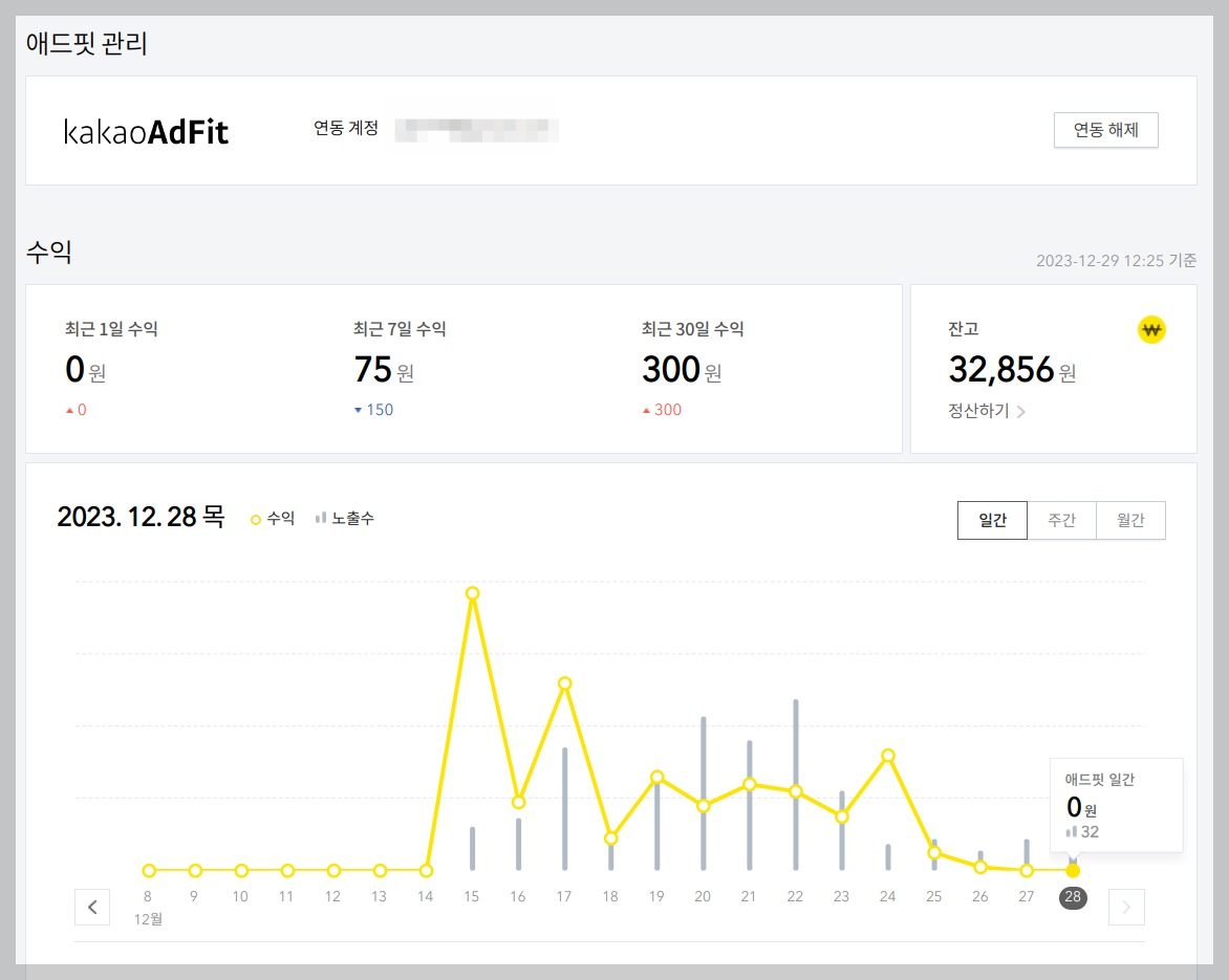 아래 그림을 보듯이 어제 애드센스 수익 12.94원(0.01달러), 카카오 애드핏 수익 0원을 보니 웃음이 나왔다. 수익이 매우 착하다. 참고로 아래 애드핏 수익에서 가장 좋은 수치는 77원이다. 여담으로 최근 애드센스로 100달러 채우기 힘들다. 예전에는 그렇게 어렵지 않았는데...