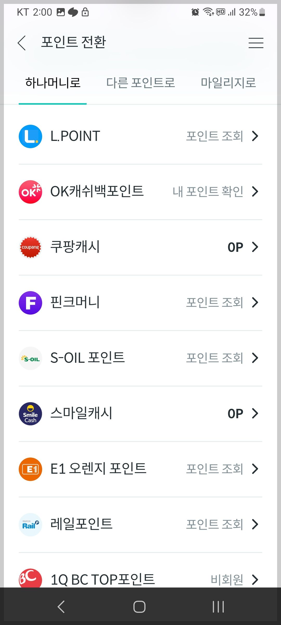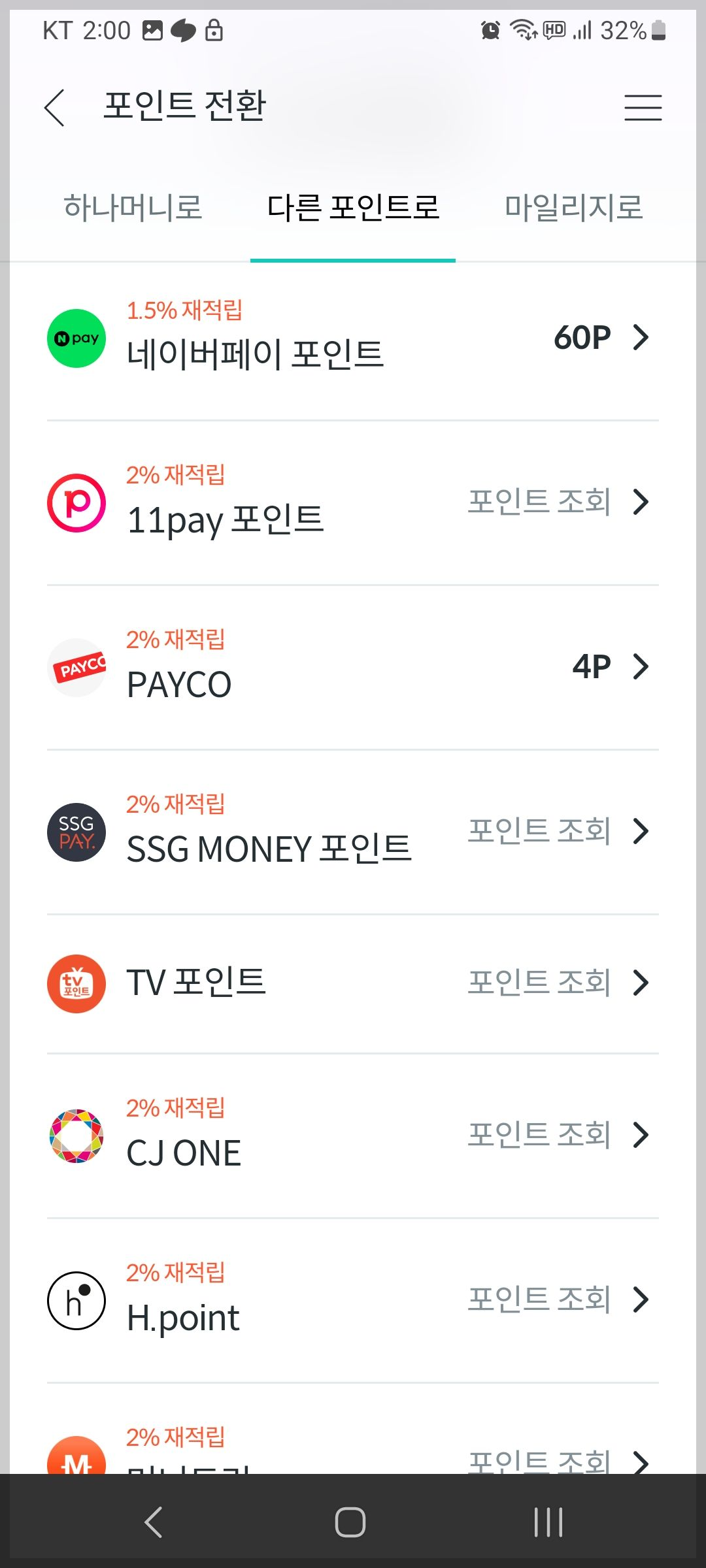 이 글을 쓰면서 생각난 것이 카카오도 캐시를 운영하고 가 있는데 카카오 애드핏으로 벌어 들인 적립금이 캐시로 전환이 안 된다는 것이 씁쓸하다. 시간이 지나면 가능하게 할 지 모르겠다. 참고로 아래 그림은 하나머니 앱의 다양하게 포인트를 전환할 수 있다. 그리고 1마일리지가 1원이 아니고 최대 45원이니 그럴 수 밖에 없다. 만약 해당 업체에 만 마일리지가 있다면 45만 원...그리고 포인트 전환은 언제든 변경될 수 있다.