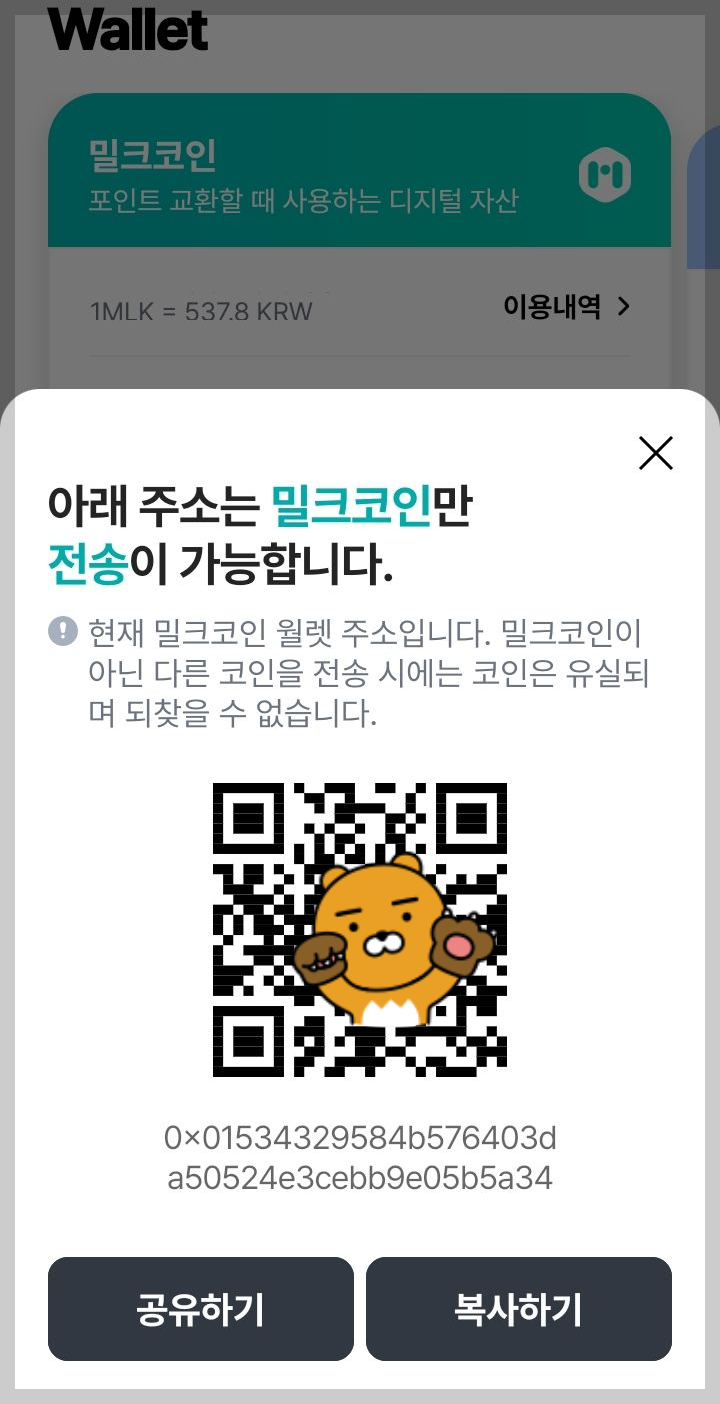 아래 그림은 밀크 앱에서 얻은 밀크 코인을 지갑으로 보내는 것이다. 내가 코인 거래 경험이 없어서 어떻게 하는지 모르겠다. 아직까지 밀크 앱에서 지갑을 만들 수 없고 단지 밀크 코인 등만 받을 수 있다. 위에서 적었듯 나는 밀크 앱에서 밀크 코인을 얻어 OK 캐쉬백 포인트로 전환한다.