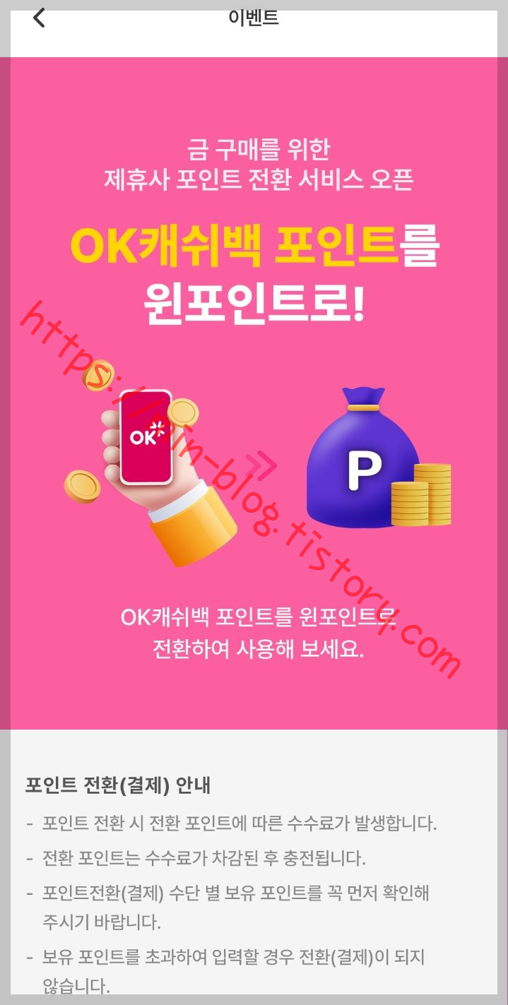 두 번 금 투자를 했으며 첫 번째는 무료로 받은 금 투자금을 사용하기 위해 OK 캐쉬백 내에서 했다. 두 번째는 OK캐쉬백에서 금 투자하는 것과 동일한 원 골드 앱에서 했다. 아래 그림을 보듯이 원 골드 앱에서 OK 캐쉬백 포인트 변환 이벤트을 사용해서 OK캐쉬백 포인트를 전환해서 금을 구매했다. 참고로 전환 수수료....