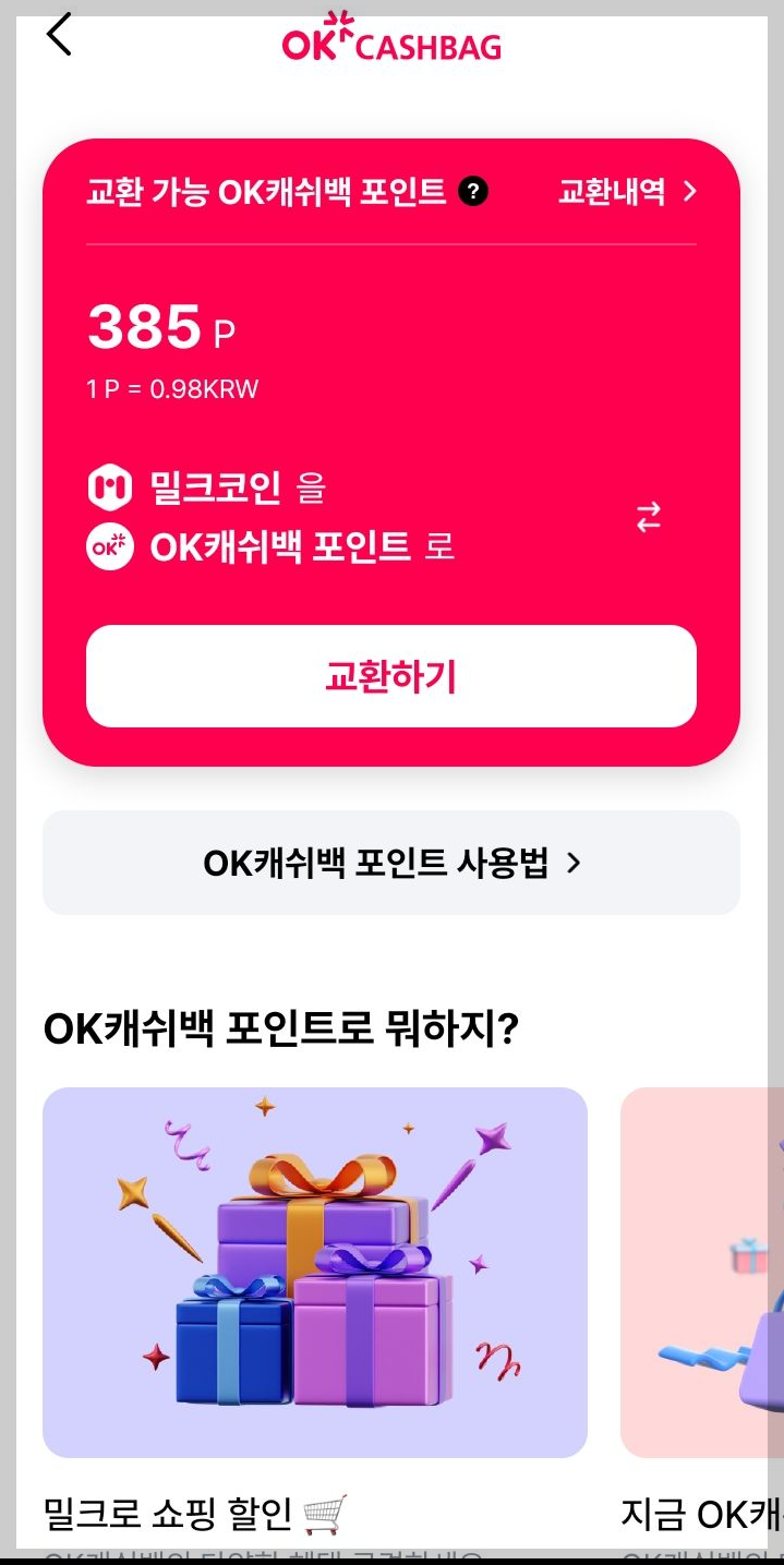 아래 나오지만 밀크 코인처럼 OK캐쉬백 포인트로 전환 가능했으면 좋겠다. 투자한 금액을 현금으로 찾을 수 있다는 것이 누군가에게는 장점으로 다가올 것이다. 나는 OK캐쉬백을 현금으로 찾는 것에 관심이 없다.