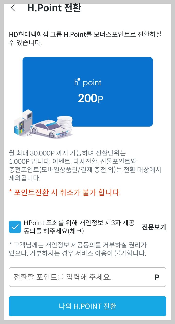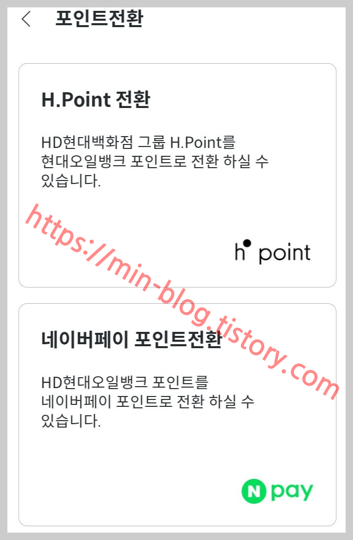 그래서 검색을 통해 H.Point 전환에 대해 알아보았다. 검색을 통해 알았는데 HD현대오일뱅크 카엔 앱을 사용하면 H.Point를 네이버페이 포인트로 전환할 수 있다는 것을 알았다. 그래서 내 폰에 HD현대오일뱅크 카엔 앱을 설치했고 아래 그림을 보듯이 H.Point와 네이버페이 포인트로 전환할 수 있다는 것을 알았다.