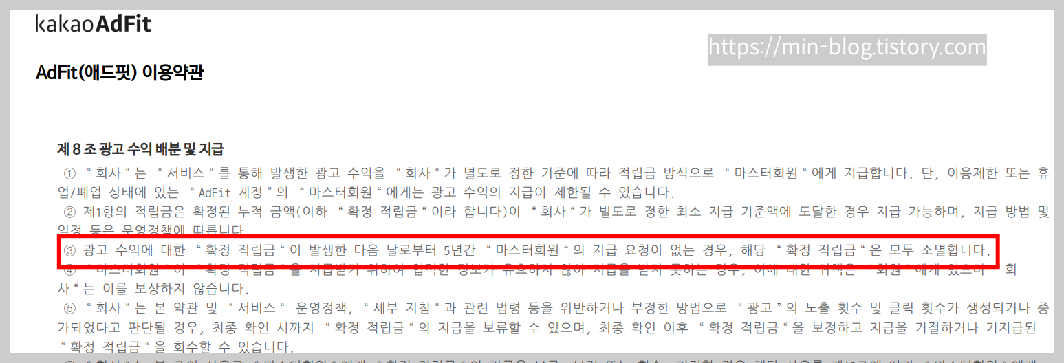 누군가는 생각할 지 모른다. 애드핏 수익은 애드센스처럼 소멸 기간이 없을 것이다. 하지만 씁쓸하지만 5년이라는 소멸기간이 있다. 5년 후부터 수익이 사라진다.