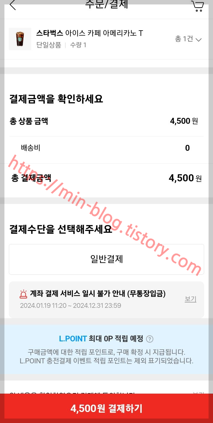 아래는 엘마트 앱에서 접속할 수 있는 엘마트 몰이다. 엘마트 앱에서 하단의 쇼핑 > e쿠폰이나 하단의 쿠폰을 터치하면 접속할 수 있고 스타벅스 기프티콘을 구입하려 한다. 아래 그림을 보듯이 엘포인트(L.POINT) 6,259 포인트가 있는데 롯데모바일상품권으로 충전한 5,000 포인트가 제외된 1,259 포인트만 사용할 수 있다.
