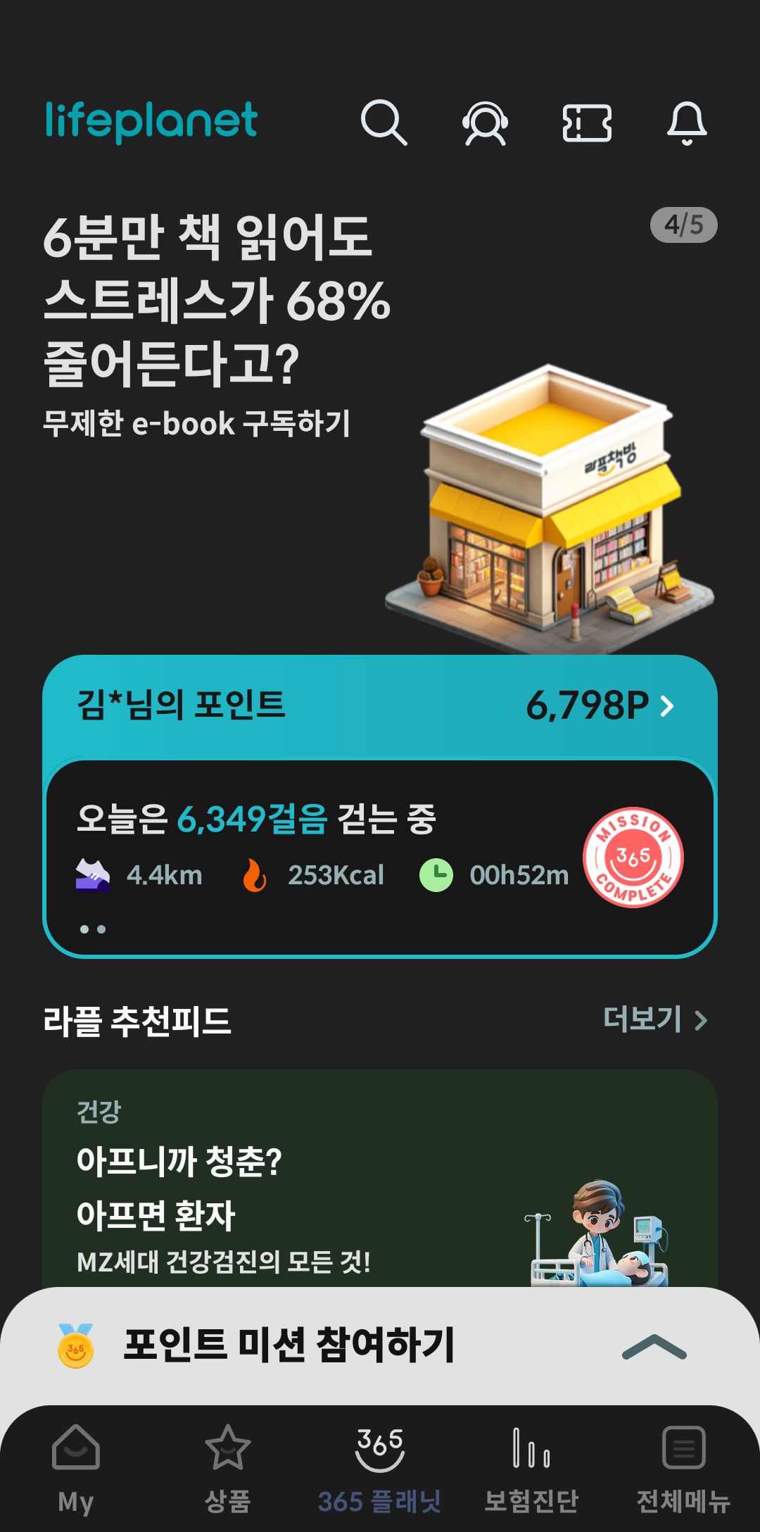 이 앱도 내일이 될 수 있고 내년이 될 수 있는데 언제 NH헬스케어처럼 100 포인트에서 50으로 줄일지 모르겠다. 아니면 만보기 기능이 없어질지 모른다. 유튜브에서 추천하는 만보기 앱을 보니 현재를 기준으로 만보기 기능이 없어진 앱이 많았다 그 앱에서 내가 처음 접했을 때 퀴즈 정답에 대한 포인트를 주는 서비스가 있었으나 지금은 없다. 참고로 라이프플래닛에서 포인트를 모으기 쉬우며 NH헬스케어도 비율과 마찬가지로 비율은 1:1이다.